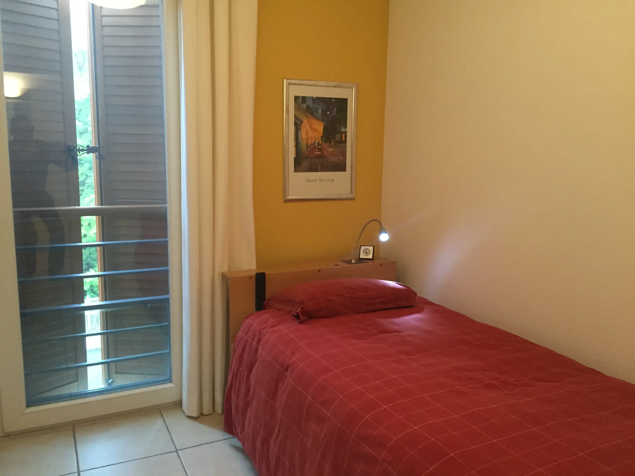 Slaapkamer 3: Electrisch eenpersoons hoog/laag bed met papagaai (90×200), garderobekast, Frans balkon met hor en luiken, ventilator.