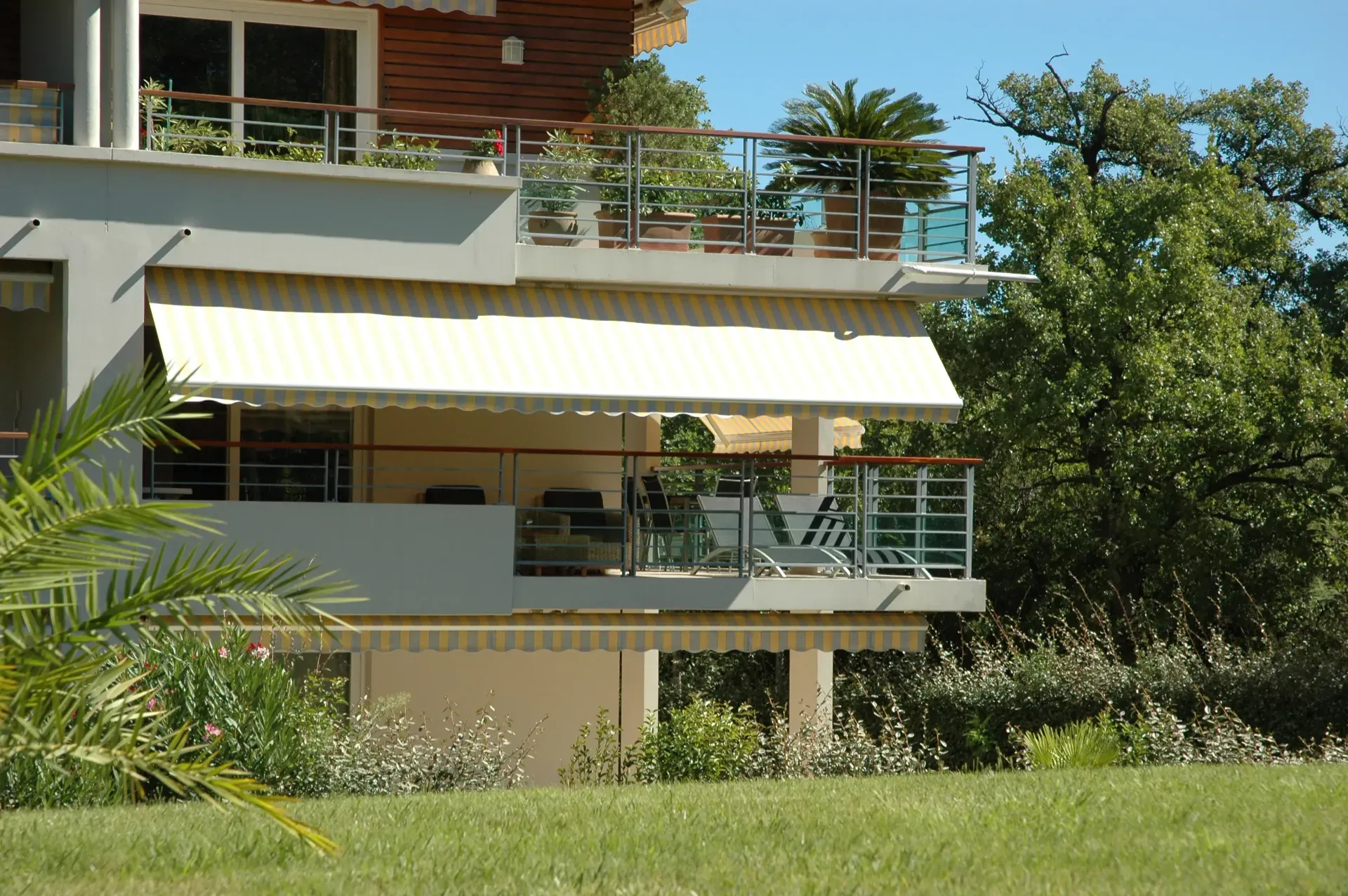 Balkon (35m2): groot hoekbalkon op het oost-zuid-westen, electrische zonneschermen, tafel met 5 stoelen, 2 lounge fauteuils, 2 ligbedden en wasrek